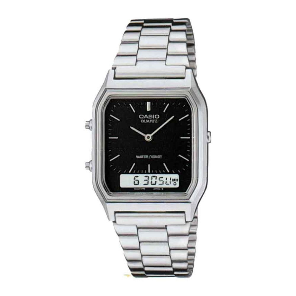 Reloj casio aq_230a_1dmq para hombre, tamaño de la caja 28 mm de acero inoxidable, tamaño del pulso 170-220 mm de acero inoxidable, color plateado, pulso de 170-220 mm, resistencia al agua hasta 100 metros